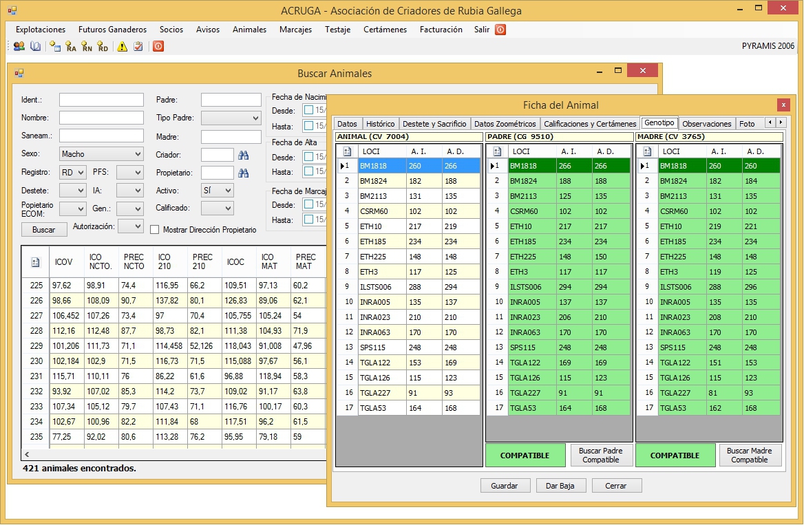 - Recepción de microsatélites y comprobación de paternidades, búsqueda de compatibilidad de padres.